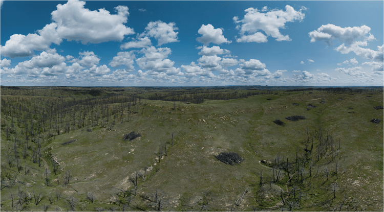 A view of Mast's first restorative carbon removal project in central Montana, including the Mast Wood Preserve MT1 burial site and hundreds of acres that will be restored to their native, pre-wildfire state.